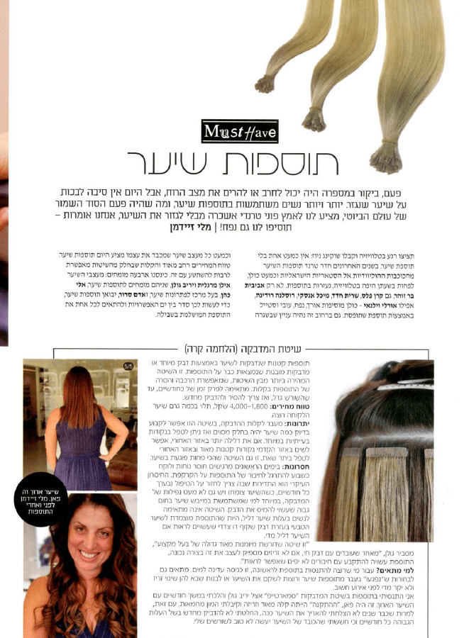 כל מה שרציתן לדעת על תוספות שיער בכתבתה של מלי זיידמן במגזין Go Style שפורסמה בתחילת ינואר 2020: שיטת המדבקה (הלחמה קרה), חיבור קרטין (הלחמה…